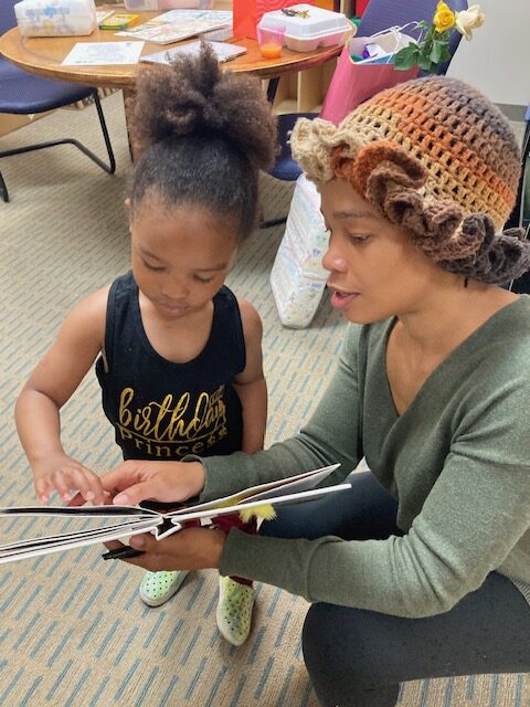 Adding to the festivities was the simultaneous celebration of a four year old’s birthday. An inspiring sight was the birthday girl’s mom “reading” the touch and feel book about baby chicks together with her. Their eyes looking at the same picture on the page and their hands moving together across the words on the opposite page demonstrated an important emergent literacy / educational bonding activity called joint attention.